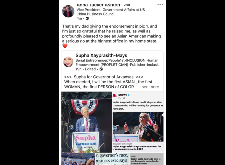 Supha Xayprasith-Mays from Bentonville, Arkansas is a candidate for GOVERNOR of ARKANSAS with the Democratic Party.